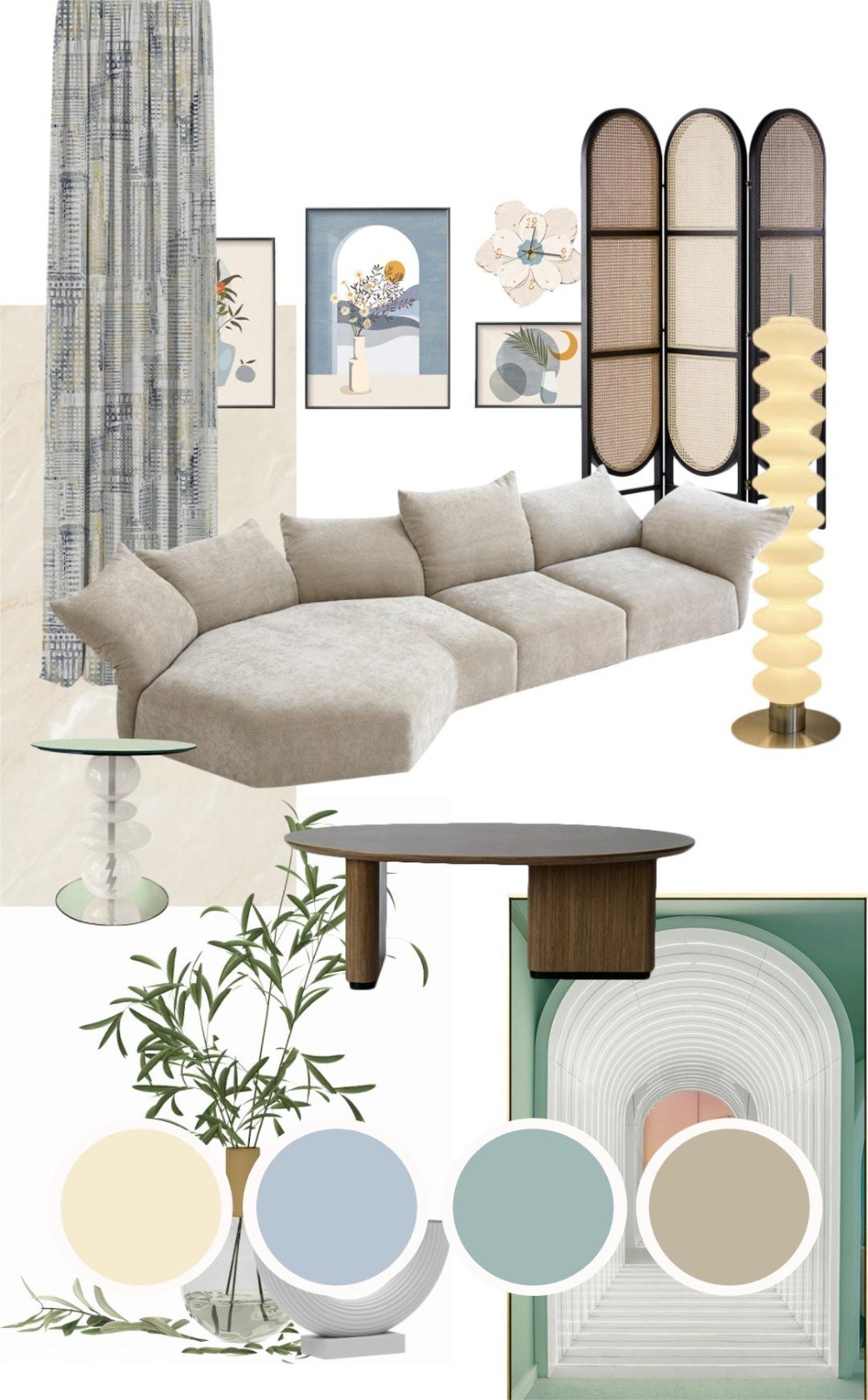 將溫柔的米色、清新綠和柔和藍結合,營造一個舒適而悠閑的場景。加入的綠色與藍色,形成色彩上的冷暖對比,