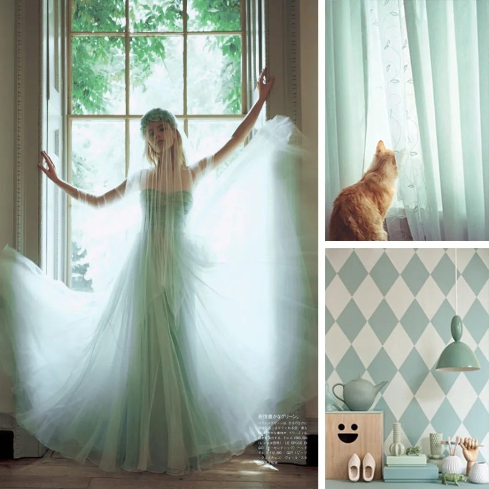 綠色在空間中不適合過大面積使用,適用于局部點綴,例如沙發,茶幾,或者一面墻,窗簾,搭配米色/白色,給人安靜,清新,沉穩的感覺。